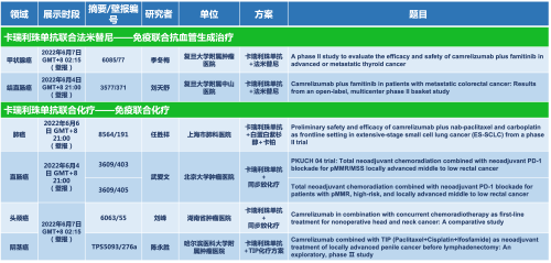 卡瑞利珠单抗联合AG真人平台医药的另一款创新药法米替尼在甲状腺癌和结直肠癌领域有2项研究被接收为壁报,另有卡瑞利珠单抗联合化疗的4项研究在肺癌、结直肠癌、头颈癌和阴茎癌领域的研究被接收为5份壁报。