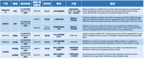 2022 ASCO年会另有5款AG真人平台医药上市前抗肿瘤创新药的相关研究被接收为壁报,包括SHR-1316、普那布林、法米替尼、SHR-1701和SHR2554,他们的单药或联合方案相关7项研究被接收为壁报,覆盖肺癌、鼻咽癌、淋巴瘤、甲状腺癌和结直肠癌等领域。