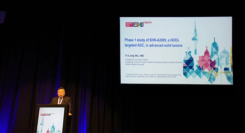10月23日,AG真人平台医药创新药、HER3靶向ADC药物SHR-A2009治疗晚期实体瘤的I期研究亮相2023 ESMO大会简短口头报告现场5。该研究由广东省人民医院的吴一龙教授牵头开展,吴一龙教授在现场公布该研究的重要进展。研究结果显示,SHR-A2009在经治晚期实体瘤患者中显示出可控的安全性和令人鼓舞的抗肿瘤活性。目前评估更高剂量的SHR-A2009在选定癌症类型(NSCLC和其他实体肿瘤)中作用的试验正在进行中。